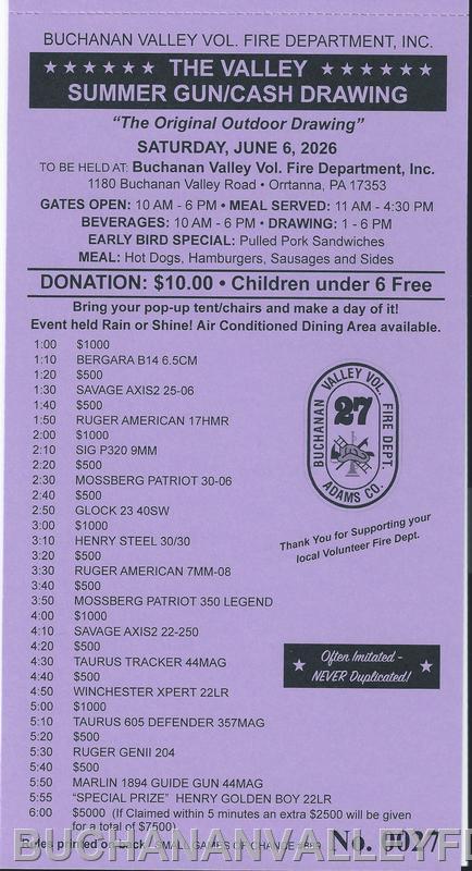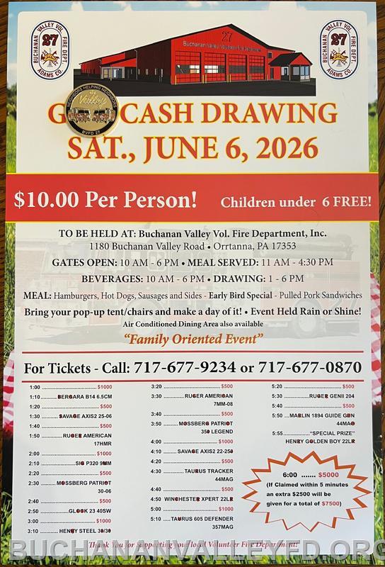 | The famous Outdoor G*n and Cash Drawing at the Buchanan Valley Volunteer Fire Department will be June 6, 2026. This is the Drawing that others compare theirs to.